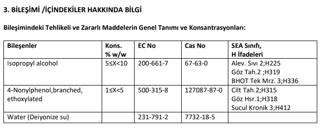 İçindekiler: Isopropyl alcohol, 4-Nonylphenol, branched, ethoxylated.